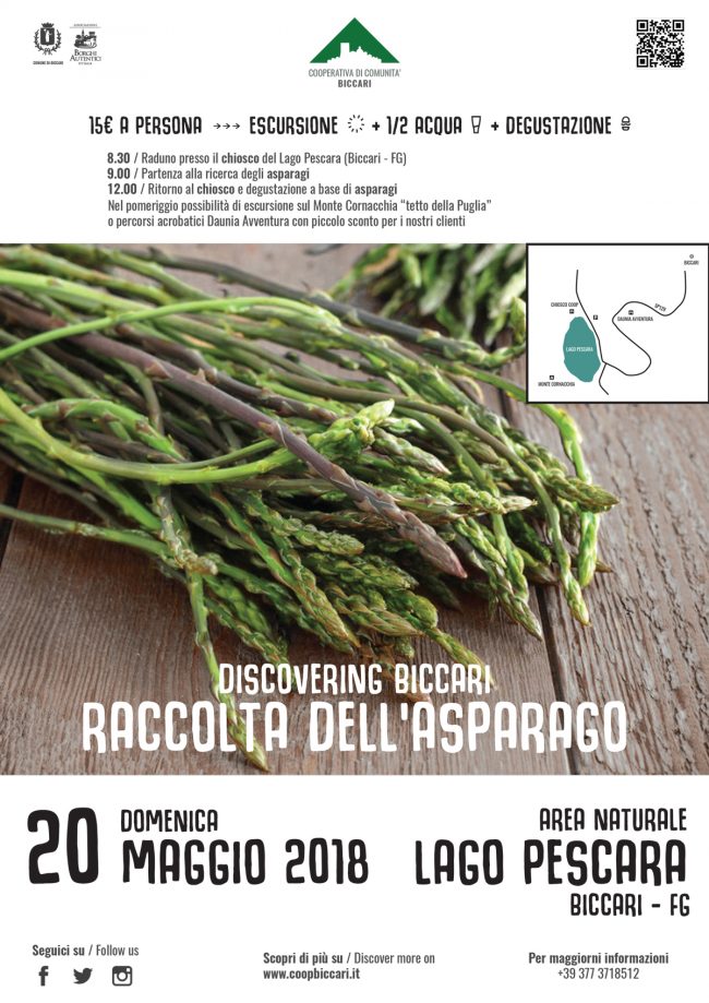 ATTENZIONE L’evento dedicato alla raccolta dell’#Asparago previsto per Domenica 20 Maggio è rimandato a data da destinarsi per impraticabilità dell’area di raccolta (causa maltempo). Domenica 20 Maggio RACCOLTA DELL’ASPARAGO Vi aspettiamo Domenica 20 Maggio per la prima edizione della “Raccolta dell’Asparago”! Ecco il programma: 8:30 – Raduno presso il chiosco del Lago Pescara a…