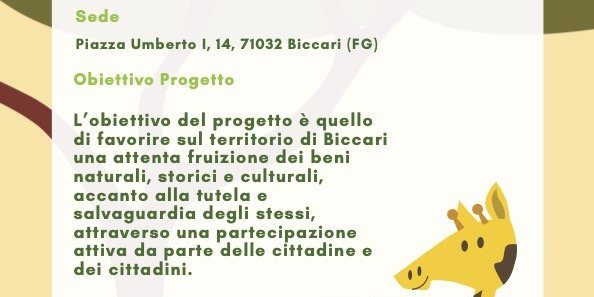 Jan112023Notizie 🙋♀️🙋 Se hai tra i 18 e i 29 anni, scegli il progetto di Servizio Civile della Cooperativa di Comunità Biccari con Legacoop Puglia! C’è infatti anche il progetto della Cooperativa di Comunità Biccari tra quelli approvati per il Servizio Civile Universale in Legacoop Puglia! Qui tutte le info: https://www.legacooppuglia.it/pubblicato-il-bando-2022…/ Se hai bisogno di ulteriori informazioni, non esitare a contattarci via mail a coopbiccari@gmail.com! Ti aspettiamo! Condividi sui social Share on FacebookShare on Facebook Share on XShare on X Pin itShare on Pinterest Share on LinkedInShare on LinkedIn Share on WhatsAppShare on WhatsApp Post navigationPreviousPrevious post:14 Agosto – Sagra della Pizza a Forno ApertoNextNext post:Riaperte le prenotazioni per la Bubble Room sul Tetto della Puglia!Articoli correlatiPasseggia tra la lavanda e dormi sotto le stelle: vivi la “Bubble Experience” a Biccari!15 May 2025Torna la Bubble Room: riaperte le prenotazioni!11 April 2025Torna l’Estate Ragazzi!14 June 2024Nuovo recapito telefonico per la Cooperativa di Comunità3 June 2024Riapre la Bubble Room: “Prosecco & aperitivo” tra i nuovi servizi aggiuntivi31 May 2024Avviso Chiosco Lago Pescara20 May 2024