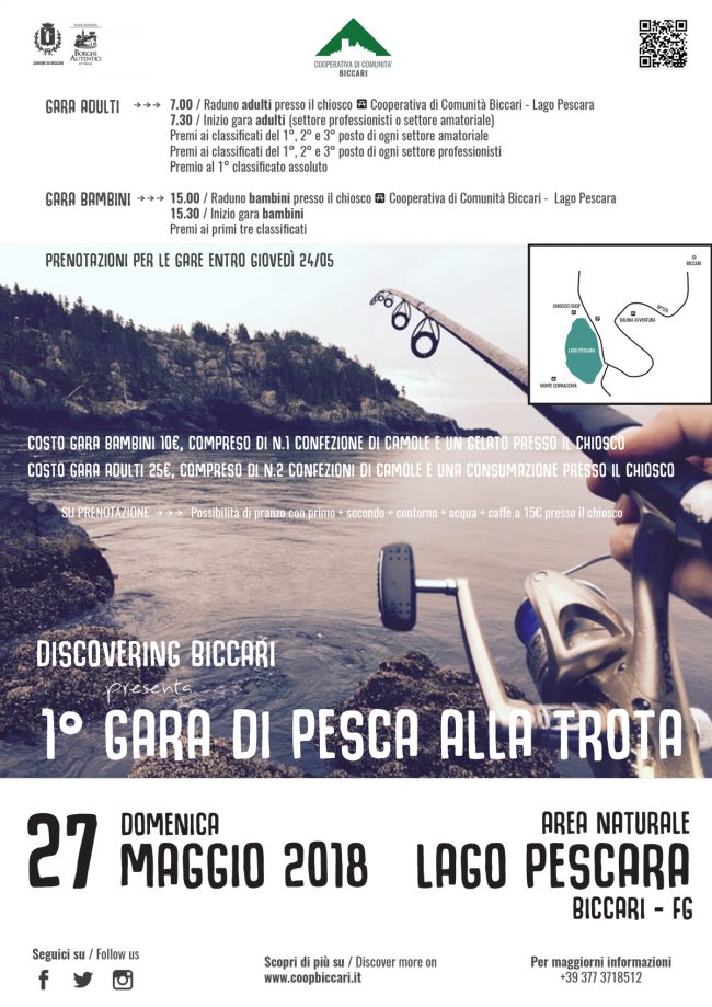 Domenica 27 Maggio ci ritroveremo sul Lago Pescara a Biccari (Fg) per la prima gara di pesca alla trota sul tetto della Puglia. Potranno partecipare sia adulti, suddivisi in amatoriali e professionisti, che bambini. Programma GARA ADULTI 7.00 – Raduno adulti presso il chiosco della Cooperativa di Comunità Biccari sul Lago Pescara 7.30 – Inizio…